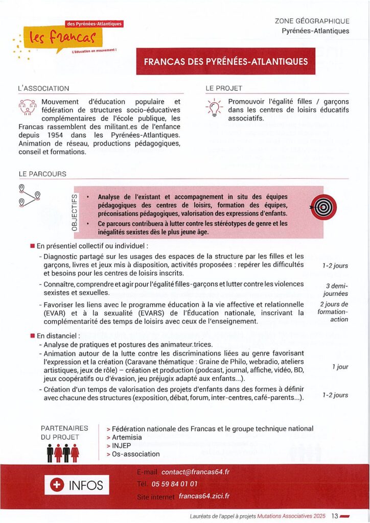 Dans le cadre d’un appel à projets de la région Nouvelle-Aquitaine, les Francas 64 se proposent d’intervenir dans votre centre de loisirs afin d’accompagner les équipes et de valoriser l’expression des enfants sur l’égalité filles/garçons.